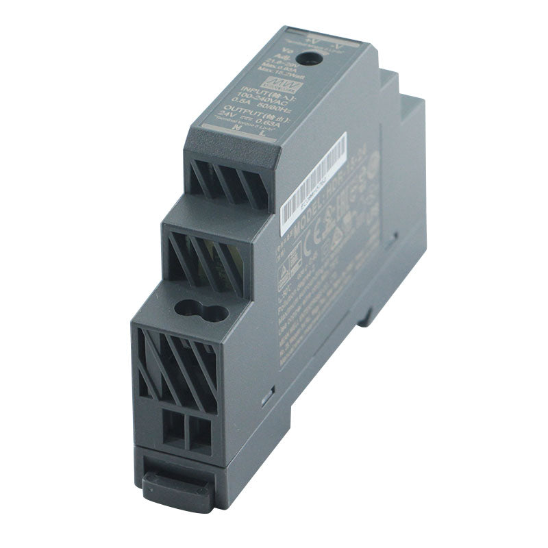 The MEAN WELL HDR-15-24 is a compact, low-power DIN rail mount power supply featuring a user-adjustable 24V DC output (typically adjustable within a range like 19-29V) at 0.63A, providing precise voltage matching for sensitive control applications. As the entry model in the versatile HDR series, it is engineered for small-scale industrial automation, instrumentation, and laboratory use where exact voltage is critical. It features a universal 85-264VAC input, high efficiency, and a fanless convection-cooled design for silent operation. With full international safety certifications (CE, cULus) and built-in overload, over-voltage, and short circuit protections, the HDR-15-24 offers reliable, customizable power for micro-PLCs, sensors, measurement devices, and small 24V control circuits.