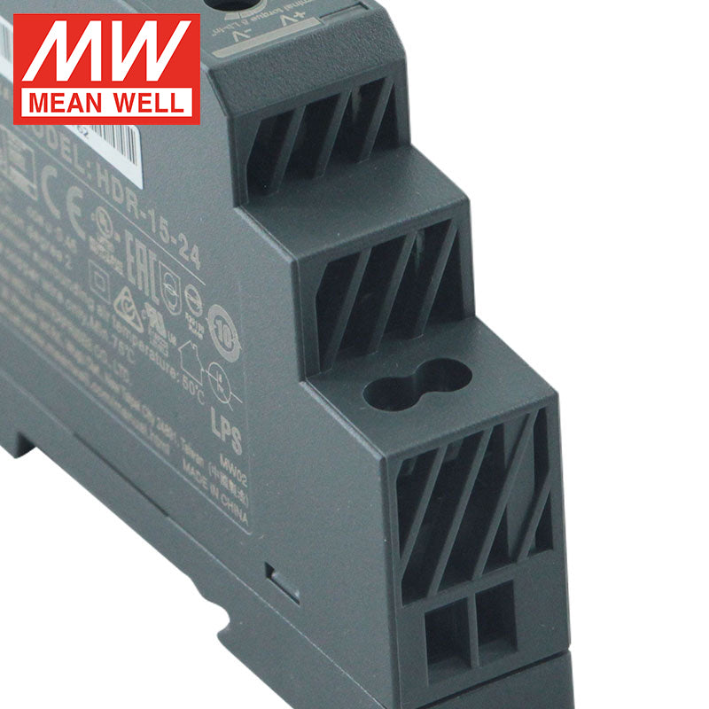 The MEAN WELL HDR-15-24 is a compact, low-power DIN rail mount power supply featuring a user-adjustable 24V DC output (typically adjustable within a range like 19-29V) at 0.63A, providing precise voltage matching for sensitive control applications. As the entry model in the versatile HDR series, it is engineered for small-scale industrial automation, instrumentation, and laboratory use where exact voltage is critical. It features a universal 85-264VAC input, high efficiency, and a fanless convection-cooled design for silent operation. With full international safety certifications (CE, cULus) and built-in overload, over-voltage, and short circuit protections, the HDR-15-24 offers reliable, customizable power for micro-PLCs, sensors, measurement devices, and small 24V control circuits.