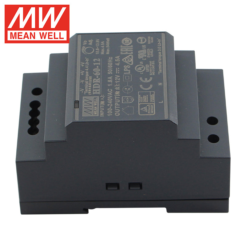The MEAN WELL HDR-60-12 is a versatile and compact 60-watt DIN rail mount power supply, featuring a user-adjustable 12V DC output (typically within a range like 10-14V) at 5A for applications requiring precise voltage control. Part of the adaptable HDR series, this unit is engineered for industrial automation, test benches, and professional equipment where exact 12V power is essential. It features a universal 85-264VAC input, high efficiency up to 88%, and a fanless convection-cooled design for silent, maintenance-free operation. With full international safety certifications (CE, cULus) and built-in overload, over-voltage, and short circuit protections, the HDR-60-12 delivers reliable and customizable power for PLC systems, sensors, industrial computing, test equipment, and various 12V devices.
