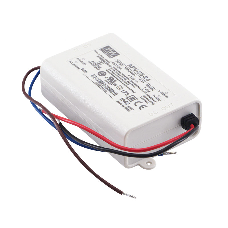 Input Voltage:90 ~ 264VAC 127 ~ 370VDC Output Current:1.05A Output Voltage:24 V Model Number:APV-25-24 Brand Name:Mean Well Place of Origin:China Efficiency:83%, 83% Product Name:APV-25-24 Protections:Overload;Overvolt;Short circuit Output Current Range:0~1.05A Warranty:2 Years Type:Constant Voltage Design Feature:High Reliability IP Rating: IP 42 Working Temp:-30 ~ +70℃ Dimming:no dimming