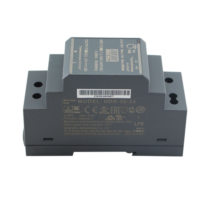 The MEAN WELL HDR-30-24 is a compact and versatile 30-watt DIN rail mount power supply, featuring a user-adjustable 24V DC output (typically within a range like 19-29V) at 1.5A for applications requiring precise higher voltage control. Part of the adaptable HDR series, this unit is engineered for small to medium industrial control panels, instrumentation, and professional equipment. It features a universal 85-264VAC input, high efficiency, and a fanless convection-cooled design for silent, maintenance-free operation. With full international safety certifications (CE, cULus) and built-in overload, over-voltage, and short circuit protections, the HDR-30-24 delivers reliable and customizable power for PLCs, sensors, small actuators, measurement devices, and various 24V control circuits.