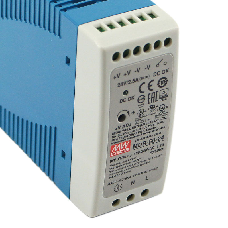 The MEANWELL MDR-60-24 is a compact and robust 60-watt DIN rail mount power supply, engineered to deliver a stable 24V DC output at 2.5A for a wide range of industrial automation and control applications. Part of the space-efficient MDR series, this unit is designed for reliable performance in control cabinets and panels where space optimization is key. It features a universal 85-264VAC input, high efficiency up to 89%, and a fanless convection-cooled design for silent, maintenance-free operation. With essential global safety certifications (CE, cULus) and built-in overload and short circuit protection, the MDR-60-24 provides dependable power for PLC systems, sensors, actuators, motor starters, and industrial lighting.