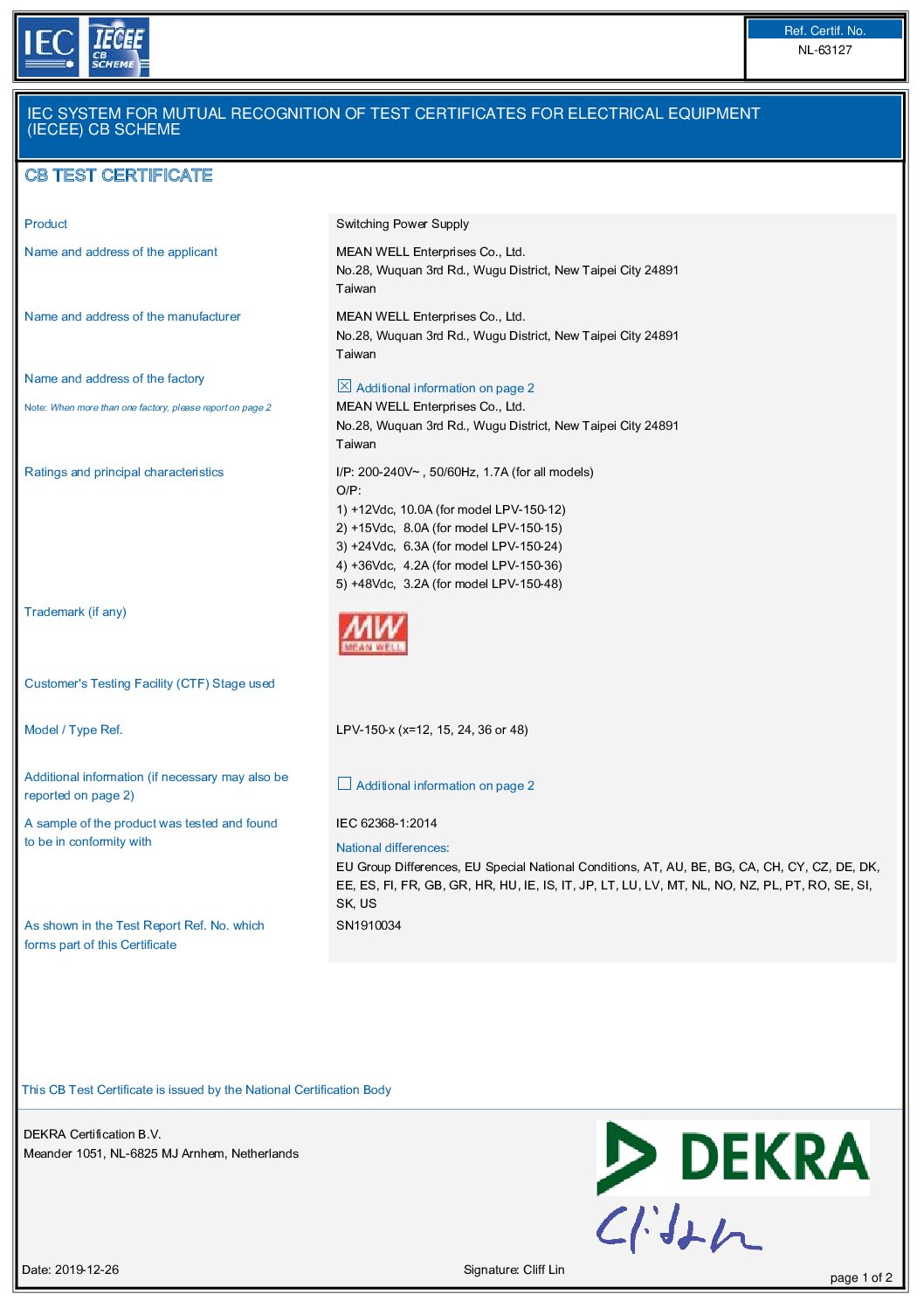 Mean Well LRS-200 200W Enclosed Single Output LED Switching Power Supply
