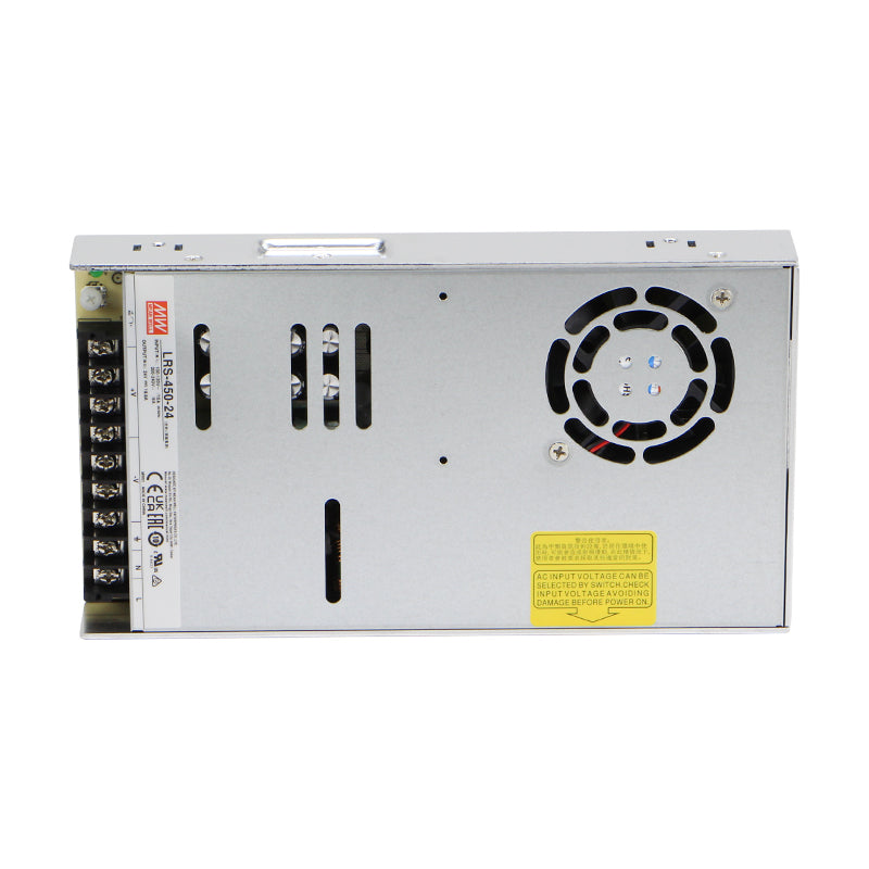 Discover reliable power with the Mean Well LRS-450 Series, a versatile family of 450-watt enclosed AC/DC power supplies engineered for demanding industrial and commercial applications. Offering a selection of single output voltages—5V, 12V, 15V, 24V, 36V, and 48V—this series provides the precise power solution for high-current needs across various fields. Each model features a universal 85-264VAC input, high efficiency up to 91.5%, and an integrated temperature-controlled fan for dependable cooling under full load. Built to meet global safety standards (UL, TUV, CB, CE) and equipped with comprehensive OCP/OVP/SCP/OTP protection, the LRS-450 series ensures stable and safe operation for industrial automation, server and network equipment, professional LED displays, telecommunications, and advanced test systems. Its rugged metal enclosure and flexible mounting options make it a robust choice for any environment.