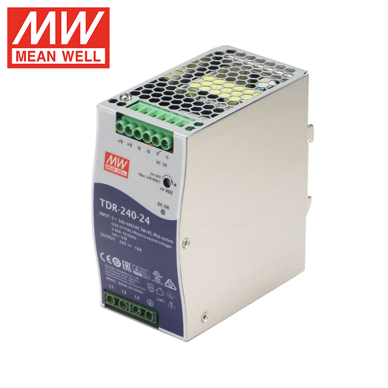 The MEAN WELL TDR-240-24 is a high-performance 240-watt DIN rail mount switching power supply, engineered to deliver robust and stable 24V DC power at 10A for demanding industrial automation and control applications. Part of the advanced TDR series, this unit incorporates professional-grade features such as active PFC (>0.95), high efficiency up to 93%, and an integrated temperature-controlled fan for optimal thermal management under continuous heavy load. With full international safety and EMC certifications (CE, cULus, RoHS) and comprehensive protections including overload, over-voltage, short circuit, and over-temperature, the TDR-240-24 provides clean, reliable power for complex PLC systems, industrial robotics, CNC machinery, professional lighting arrays, and advanced manufacturing equipment.