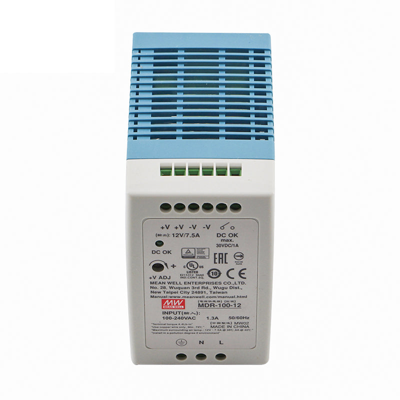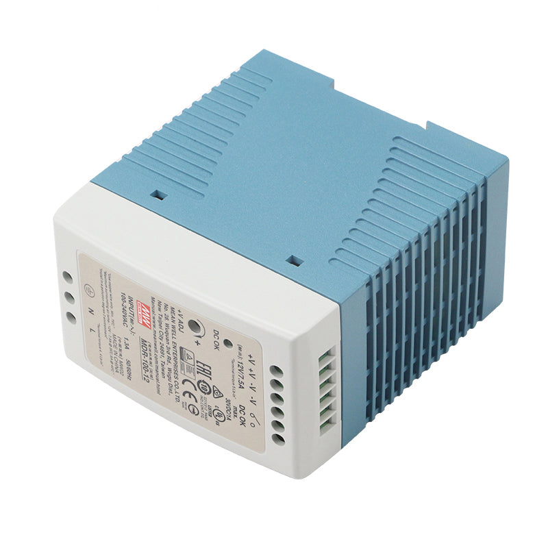 The MEAN WELL MDR-100 Series offers compact and reliable 100-watt DIN rail mount power solutions, available in 12V, 24V, and 48V DC single-output models for versatile industrial control applications. Designed for efficient use of panel space, this series features a universal 85-264VAC input, high efficiency up to 90%, and a fanless convection-cooled design for silent, maintenance-free operation. With essential global safety certifications (CE, cULus) and built-in protections against overload and short circuit, the MDR-100 models (MDR-100-12, MDR-100-24, MDR-100-48) provide dependable power for PLC systems, sensors, actuators, industrial lighting, and security systems within control cabinets and automation panels.