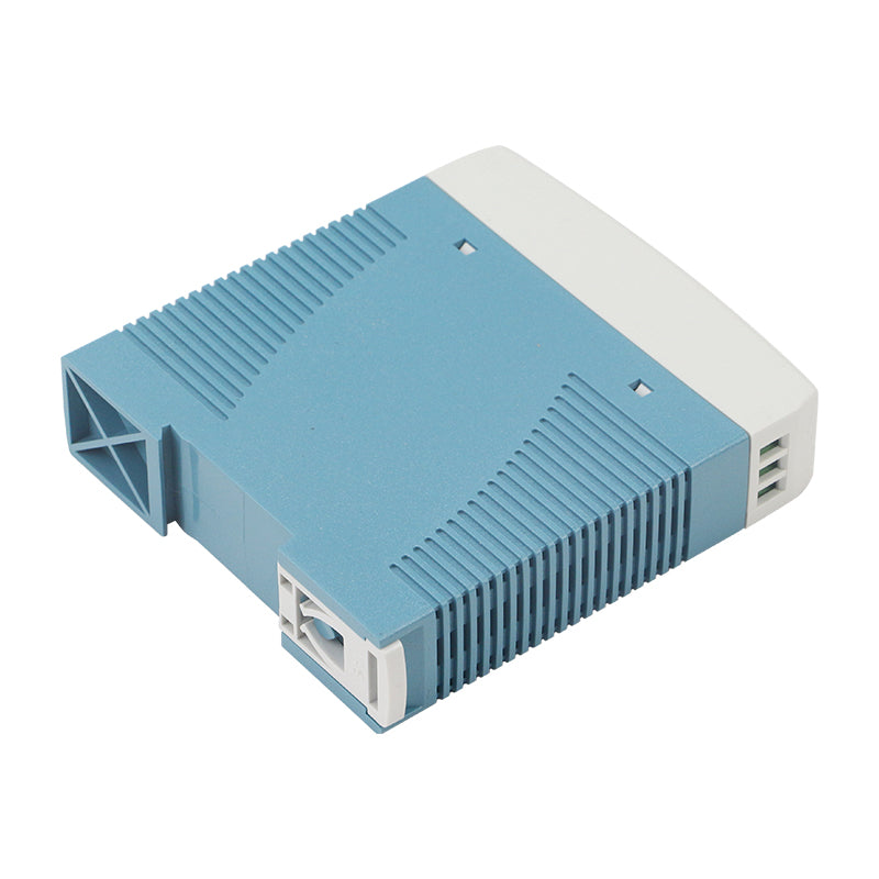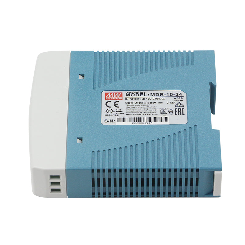 The MEANWELL MDR-10-24 is a compact and reliable 10-watt miniature DIN rail mount power supply, delivering a stable 24V DC output at 0.42A for space-constrained control and automation applications. Part of the MDR series, this unit is designed for maximum efficiency in a minimal footprint, making it ideal for small control panels, sensor clusters, and instrumentation. It features a universal 85-264VAC input, high efficiency, and a fanless design for silent, maintenance-free operation. With essential safety certifications (CE, cULus) and built-in protections against overload and short circuit, the MDR-10-24 provides dependable low-power control voltage for PLCs, relays, sensors, and other 24V DC devices.