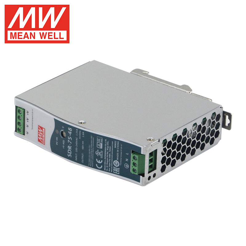 The MEAN WELL SDR-75-48 is a high-efficiency, compact 75-watt enclosed switching power supply, engineered to deliver a stable 48V DC output at 1.6A. Part of the SDR series, this unit is designed for reliability in industrial and telecommunications applications requiring higher voltage in a space-saving design. It features a universal 85-264VAC input, high efficiency up to 91%, and a fanless metal enclosure for silent, maintenance-free operation. With full international safety certifications (UL, TUV, CB, CE) and comprehensive protection against overload, over-voltage, short circuit, and over-temperature, the SDR-75-48 is an ideal power source for industrial control systems, Power over Ethernet (PoE) equipment, professional audio devices, and high-power LED installations.