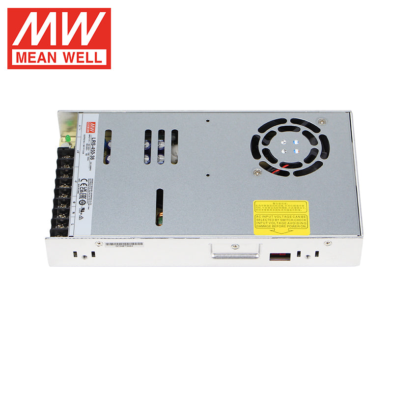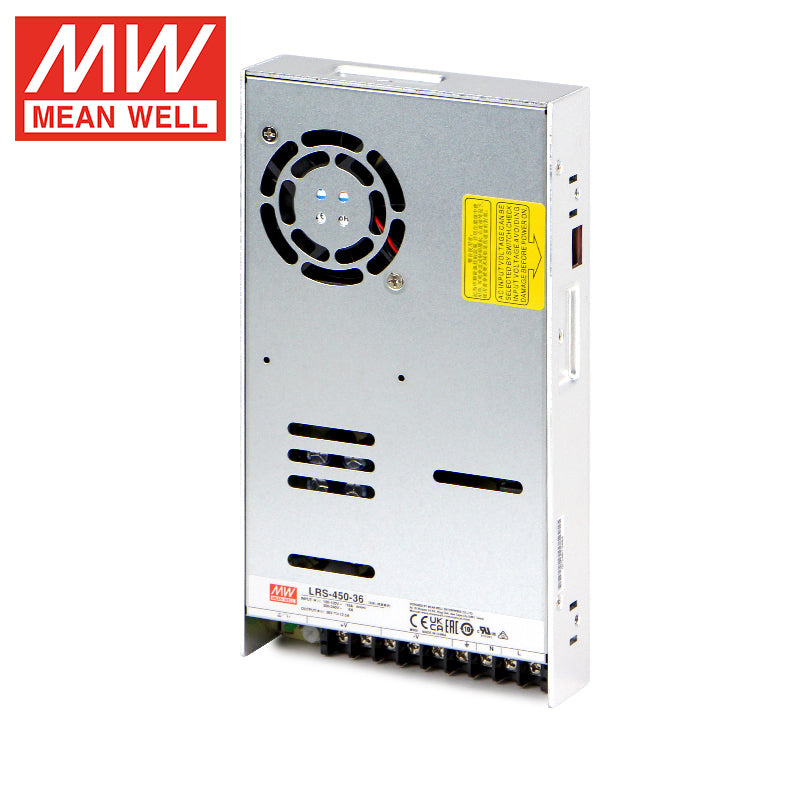 The Mean Well LRS-450-36 is a high-performance industrial switching power supply engineered to deliver stable, high-voltage 36V DC power at up to 12.5A, providing 450 watts of continuous output for demanding applications. Designed for industrial automation, professional equipment, and telecommunications, this unit features a universal 85‑264VAC input, high efficiency up to 91.5%, and an integrated temperature‑controlled fan for optimal thermal management under sustained heavy loads. With full UL, TUV, CB, and CE safety certifications and comprehensive OVP, OCP, SCP, and OTP protection, the LRS‑450‑36 ensures reliable, fail‑safe operation. It is an ideal power source for industrial motor drives, CNC machinery, high‑power LED arrays, professional audio systems, telecommunications infrastructure, and test benches requiring high‑voltage, high‑current 36V DC power.