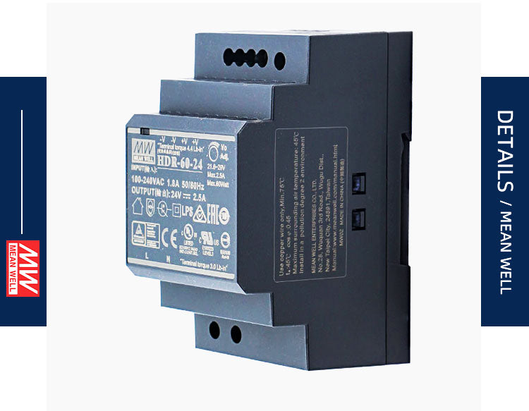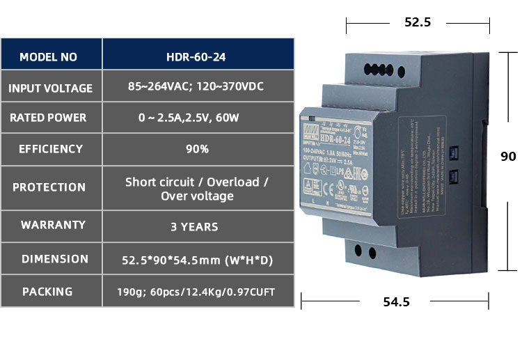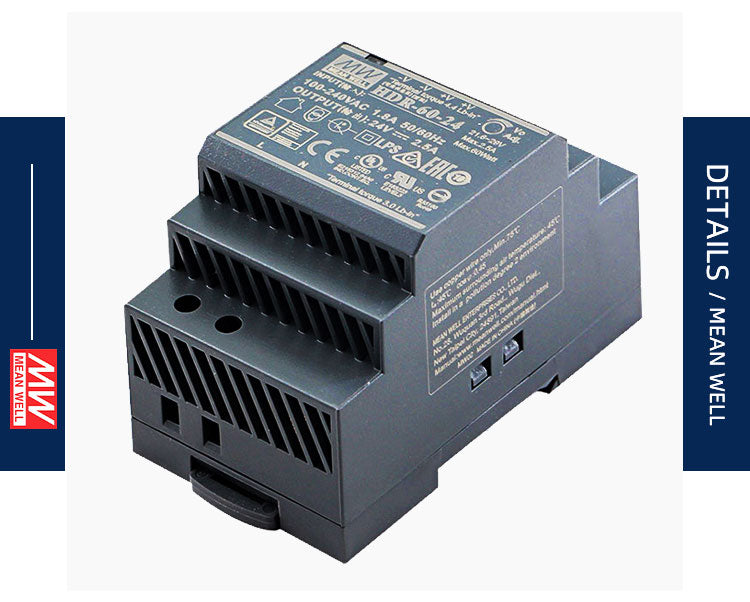 The MEAN WELL HDR-60-24 is a versatile and compact 60-watt DIN rail mount power supply, featuring a user-adjustable 24V DC output (typically within a range like 19-29V) at 2.5A for applications requiring precise higher voltage control. Part of the flexible HDR series, this unit is engineered for industrial automation, instrumentation, and professional equipment where exact 24V power is critical. It features a universal 85-264VAC input, high efficiency up to 89%, and a fanless convection-cooled design for silent, maintenance-free operation. With full international safety certifications (CE, cULus) and built-in overload, over-voltage, and short circuit protections, the HDR-60-24 delivers reliable and customizable power for PLC systems, sensors, actuators, motor controllers, and test equipment.