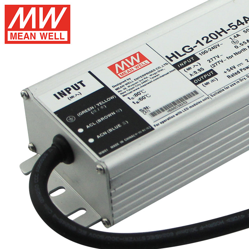 Warranty(Year):7-Year Model Number:HLG-120H-54A Brand Name:Mean Well Place of Origin:Zhejiang, China Application:Led Lighting, Outdoor Lighting, Street Light, Flood Light, LED Lighting Case Material:Aluminum Dimming:Dali Dimming Mode:Non Efficiency:90-99% Energy Transfer:AC-DC Input Voltage:90~305 VAC 127~431 VDC Lighting solutions service:Lighting And Circuitry Design Output Current:2.3A Output Frequency:/ Output Power:101 – 200W Output Type:Single Product Weight(kg):1.12 Topology:Ac-Dc Converter Type:waterproof, Constant Voltage+Constant Current Product Name:120W 54V LED Driver Certification: CE CB Protections:Short Circuit Overtemp Overload Overvolt voltage output:27-54v Power Factor:PF>0.98 Working Temp:-40~+80℃ Waterproof:IP67 warranty:7 years