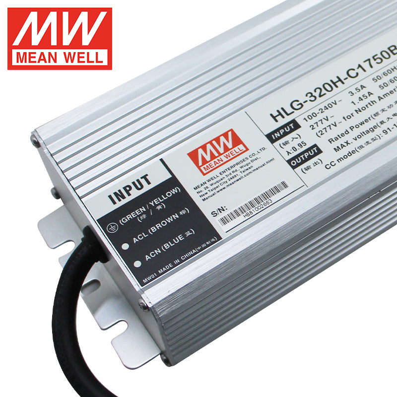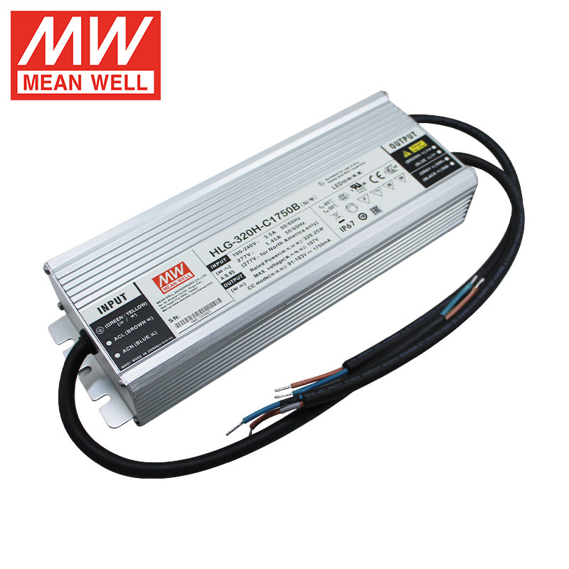 Input Voltage:90 ~ 305VAC     127 ~ 431VDC Output Current:1.75A Output Voltage:91 ~ 183V Model Number:HLG-320H-C1750B Brand Name:MeanWell Place of Origin:Guangdong, China Output Frequency:/ Output Type:Single Product Name:Mean Well HLG-320H-C1750B Application:LED Lighting Type:Constant Current Mode LED Driver Warranty:7 Years Certification: CE CB Efficiency:93.5% Protections: Short Circuit/ Over Temperature/ Over Current/ Over Voltage Feature:High Reliability Working Temp:-40~+90 ℃ Material: Aluminum