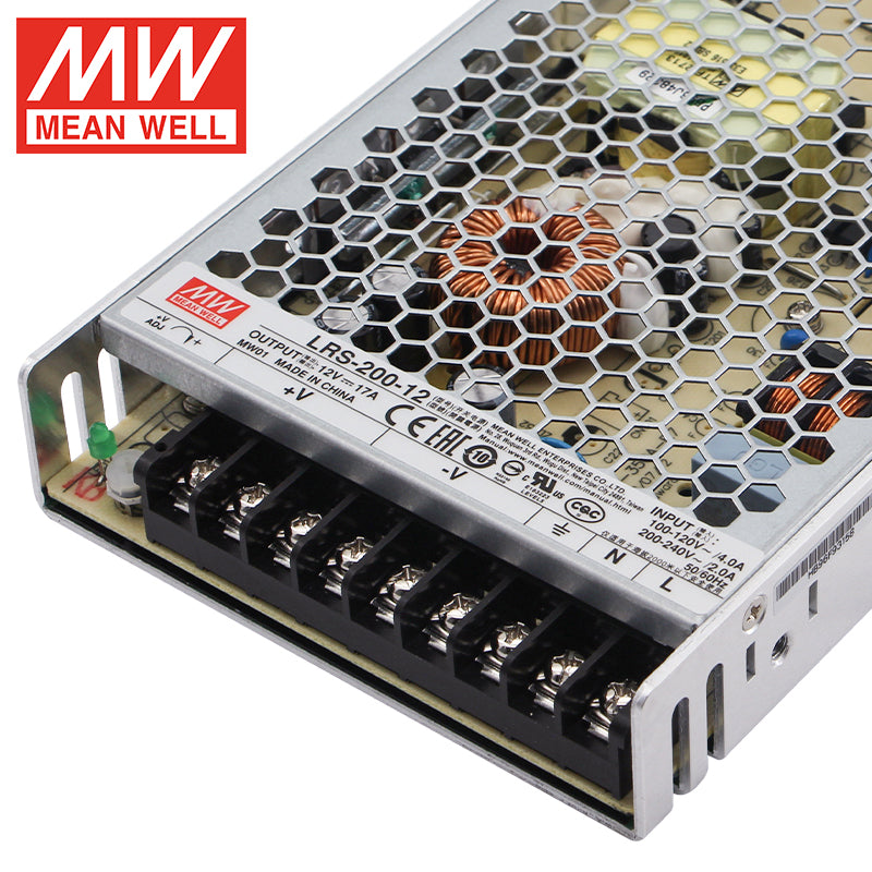 The Mean Well LRS-200-12 is a high-performance 200-watt enclosed switching power supply designed to deliver substantial 12V DC power at up to 16.7A for demanding commercial and industrial applications. Engineered for reliability, this unit features a universal 85-264VAC input, high efficiency up to 89%, and a robust fanless metal enclosure, ensuring silent operation and effective heat dissipation. With full international safety certifications (UL, TUV, CB, CE) and comprehensive protections including overload, over-voltage, short circuit, and over-temperature, the LRS-200-12 provides stable and clean power for high-current 12V systems. It is an ideal power source for large LED displays, high-density storage servers, industrial computing, powerful audio systems, and intensive telecommunications equipment.