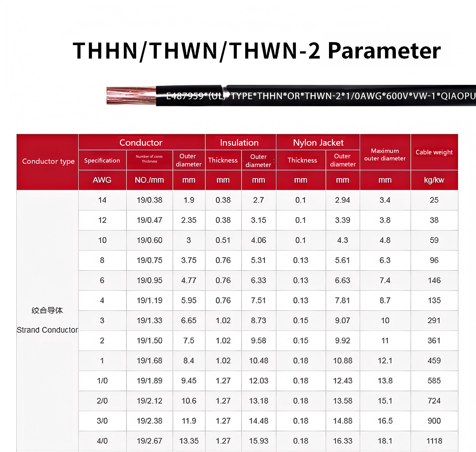 | AWG Size | Conductor Stranding | Insulation Thickness (mm) | Nylon Jacket Thickness (mm) | Approx. Overall Diameter (mm) | Approx. Weight (kg/km) |