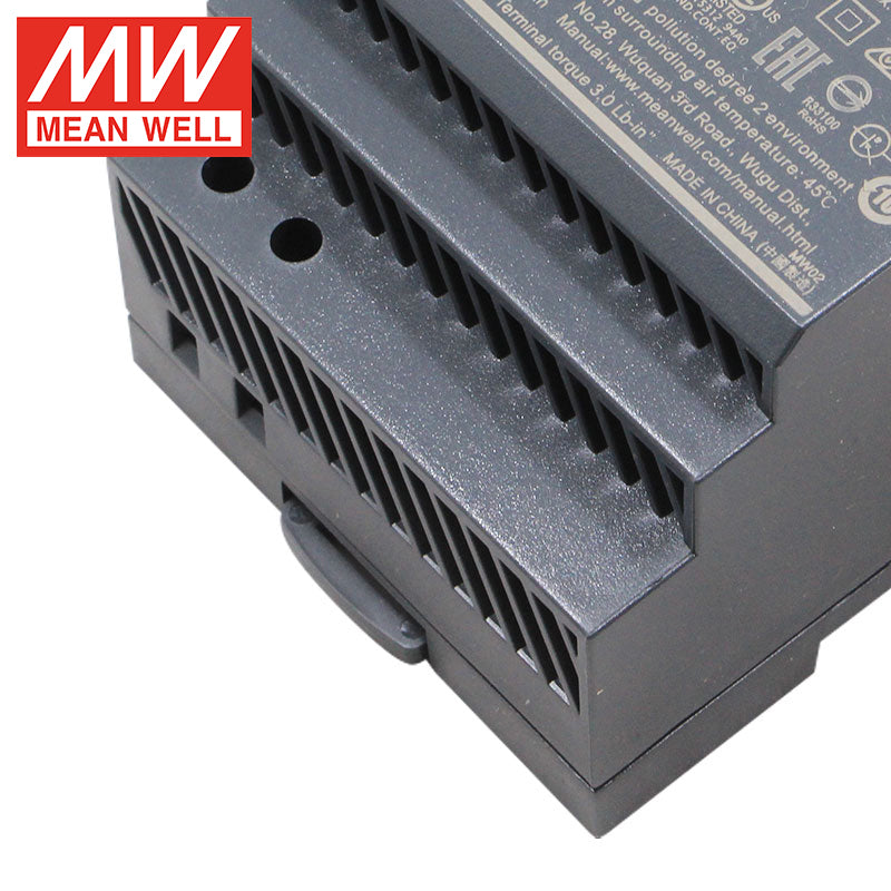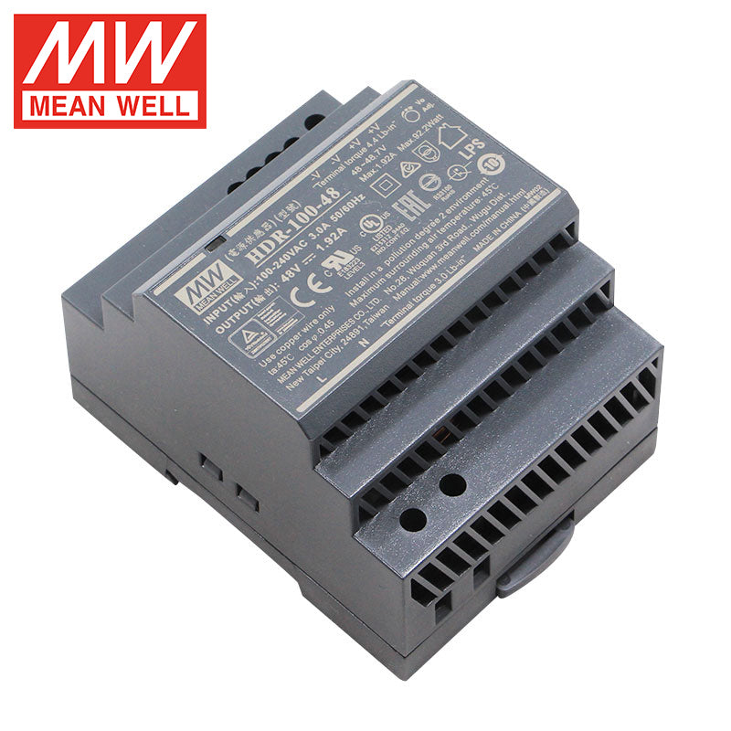 The MEAN WELL HDR-100-48 is a robust 100-watt DIN rail mount power supply, featuring a user-adjustable 48V DC output at 2.1A for specialized high-voltage applications requiring precise control. Part of the versatile HDR series, this unit is engineered for telecommunications, industrial control, and specialized professional equipment. It features a universal 85-264VAC input, high efficiency up to 91%, and a convection-cooled design for reliable operation. With full international safety certifications (CE, cULus) and built-in overload, over-voltage, and short circuit protections, the HDR-100-48 delivers dependable and customizable power for telecom systems, industrial controllers, specialized measurement instruments, and other devices requiring stable, adjustable 48V DC.