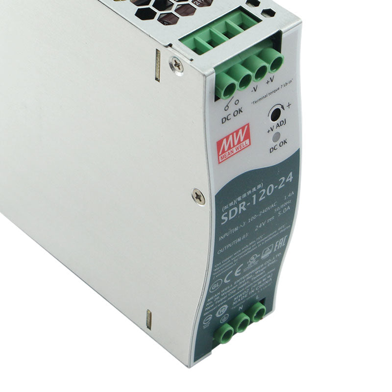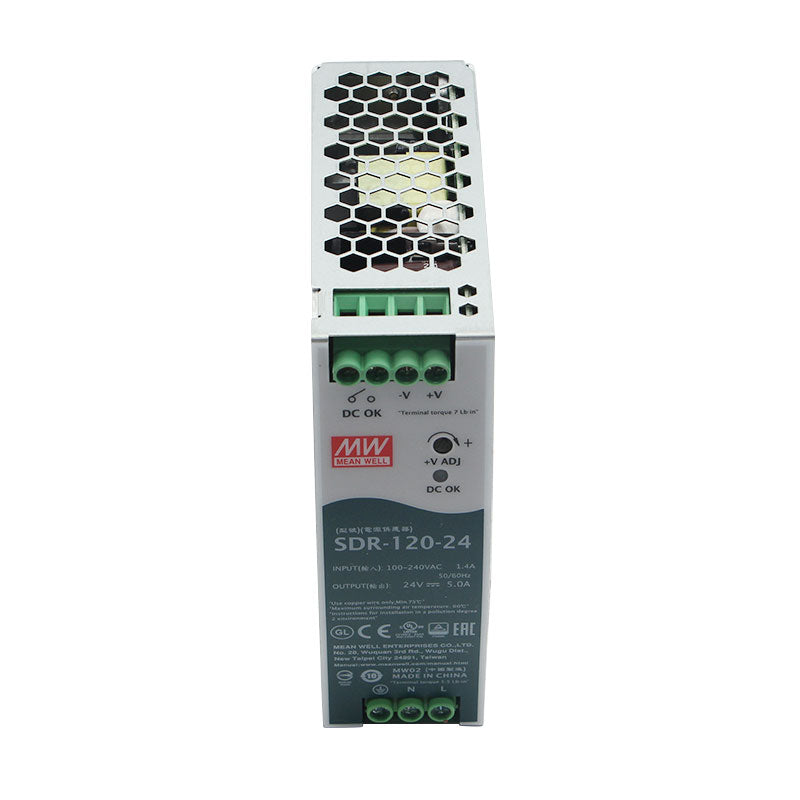 The MEAN WELL SDR-120-24 is a robust 120-watt enclosed switching power supply, engineered to deliver a stable 24V DC output at 5A for demanding industrial and commercial applications. As part of the reliable SDR series, this unit is built for high performance in a compact form factor. It features a universal 85-264VAC input, high efficiency up to 90.5%, and a fanless metal enclosure for silent, maintenance-free operation. With full international safety certifications (UL, TUV, CB, CE) and comprehensive protection against overload, over-voltage, short circuit, and over-temperature, the SDR-120-24 is an ideal power source for industrial automation systems, PLC control panels, professional LED lighting arrays, point-of-sale terminals, and various 24V machinery controls.