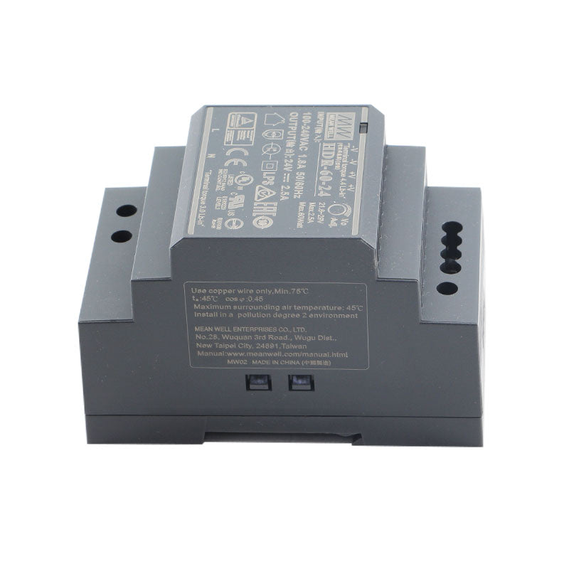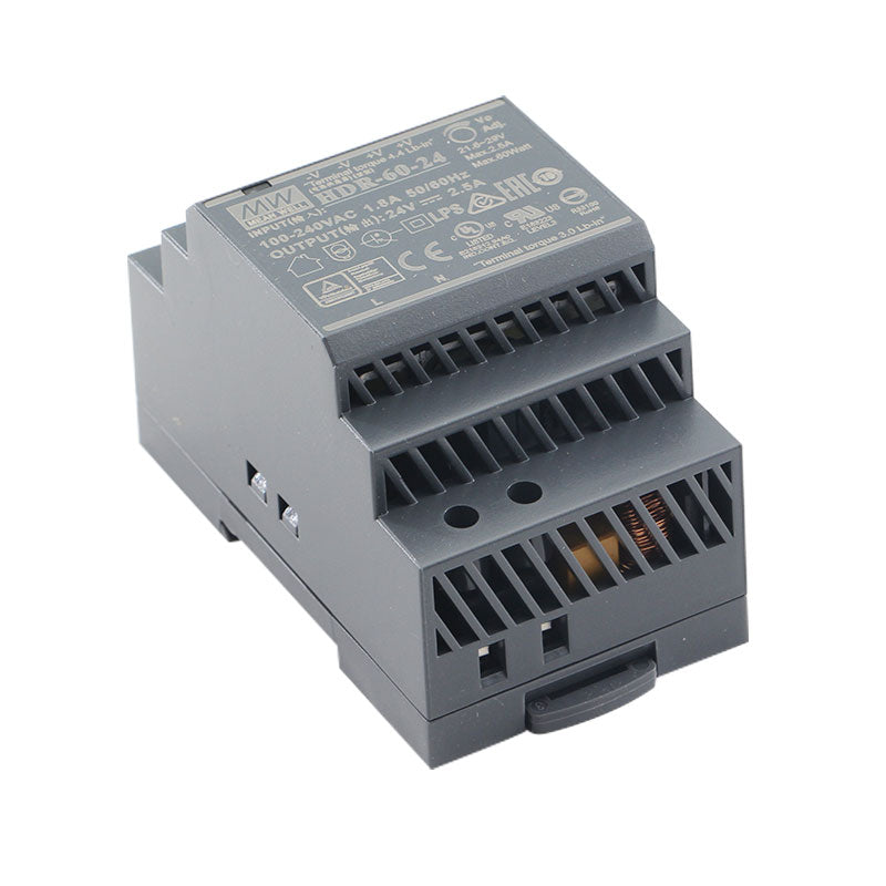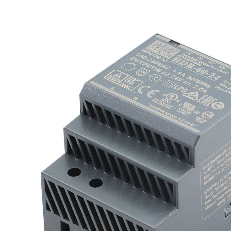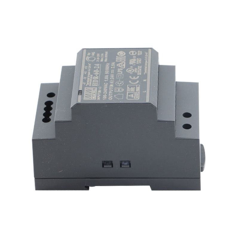 The MEAN WELL HDR-60-24 is a versatile and compact 60-watt DIN rail mount power supply, featuring a user-adjustable 24V DC output (typically within a range like 19-29V) at 2.5A for applications requiring precise higher voltage control. Part of the flexible HDR series, this unit is engineered for industrial automation, instrumentation, and professional equipment where exact 24V power is critical. It features a universal 85-264VAC input, high efficiency up to 89%, and a fanless convection-cooled design for silent, maintenance-free operation. With full international safety certifications (CE, cULus) and built-in overload, over-voltage, and short circuit protections, the HDR-60-24 delivers reliable and customizable power for PLC systems, sensors, actuators, motor controllers, and test equipment.